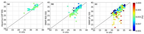 Scatter plots of satellite SSS ((a) Aquarius CAP, (b) SMAP RSS, and (c) SMAP JPL) against in-situ salinity per 1° bin. The colors represent the mean sea-ice fraction per 1 × 1. For better visualization, we used a logarithmic scale.
