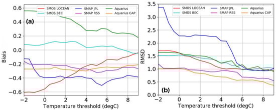 (a) Bias and (b) RMSD between in-situ observations and satellite SSS of SMOS BEC (cyan), SMOS LOCEAN (red), Aquarius (green), Aquarius CAP (orange), SMAP RSS (magenta), and SMAP JPL (blue) per 1° bin as a function of the minimum temperature considered.