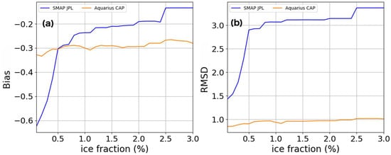 (a) Bias and (b) RMSD between in-situ observations and satellite SSS of Aquarius CAP (orange) and SMAP JPL (blue) per 1° bin as a function of a maximum sea-ice concentration considered.