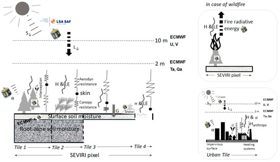LSA-SAF surface energy balance model. Over each tile the model is solved for a variety of inputs including downwelling radiative fluxes (, ), surface albedo (), vegetation properties (all from LSA-SAF), surface and root zone soil moisture (hydrology SAF) and near surface meteorological variables from ECMWF (, , and ). Separate schemes are used for wildfire and urban tiles. All quantities obtained from satellite have an MSG icon next to them. The related definitions are provided in the main text.