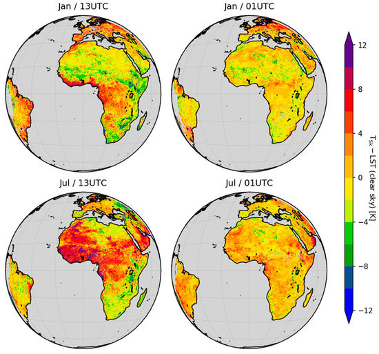 Possible reasons for the observed discrepancies are discussed in Section 4. Note that clear-sky EB model skin temperature is not used in the proposed all-weather LST product. Comparisons were also performed using the full month of July of 2018 (since all the inputs were readily available for that period) and the obtained patterns are very similar to those shown in Figure 4 (not shown), with exception of a reduced positive bias over West Africa at 13UTC. This reduction could be related to the higher sampling available for the comparison. This confirms the systematic character of these biases and the need for further model improvements.