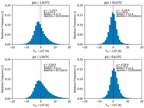 Histograms of the instantaneous clear sky differences of in Figure 4 (units: K). The red dashed line denotes the median difference. Also indicated are the values of the median difference, , the median of the absolute residuals, , the root mean squared difference (RMSD) and the number of pixels used in the comparison.