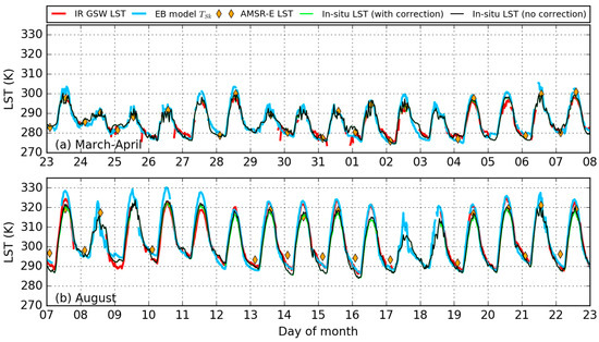 To illustrate the general behavior of the different products, Figure 6 provides time-series of the various LST datasets for Evora (in situ with and without directional correction, IR split-window LST, all-weather EB model and AMSR-E LST), for a spring (23 March–7 April 2010) and summer (7–22 August 2010) period. The area surrounding Evora station experiences strong seasonal (and inter-annual) vegetation variability as the understory grows and desiccates. This introduces some emissivity variability as well as significant temperature contrasts between surface elements, particularly during summer. A correction that accounts for directional effects was introduced in order to improve comparisons with MSG/SEVIRI level 2 clear-sky LST estimates [18,90]. The adjusted time series (shown in green) show differences to the original in situ estimate up to 2 K, with lower LST values around the daily maximum for the periods shown. This is plausible since the non-adjusted in situ values correspond to a composite of sunlit ground and tree canopy temperatures and do not include the fraction of shaded areas observed by MSG/SEVIRI.