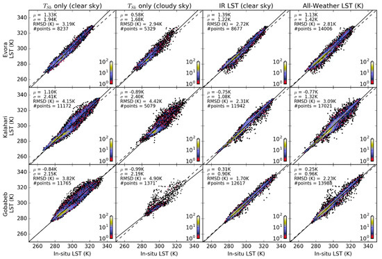 Scatterplots comparing the various LST estimates and matched-up in situ LST. Left to right column: clear-sky EB model skin temperature, cloudy-sky EB model skin temperature, IR LST (clear-sky) and all-weather LST product (IR LST + Cloudy Sky EB model skin temperature). Top to bottom row: Evora, Kalahari, Gobabeb. Also shown are summary (robust) statistics: median difference (), median absolute deviation (), root-mean-square differences (RMSD), and number of matchups (#points). Colors denote data point density, computed over a 100 × 100 grid. Axes are common to all panels.