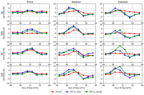 Diurnal cycle of the median differences between satellite and in situ surface temperature estimates (K) for each station and season (December, January and February—DJF, April and May—MAM, June, July and August—JJA and September, October and November—SON). IR LST is represented in red, and the clear (cloudy) sky cases of EB skin temperature are represented in blue (green). Values were averaged over 3h. Axes is common to all panels.