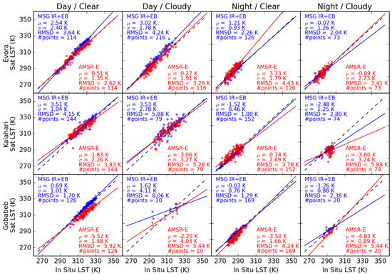 In Figure 7 the EB model skin temperature (separated into clear sky and cloudy sky cases) is evaluated against in situ estimates for the 3 stations, as well as the IR LST (for clear sky only) and the derived all-weather LST product i.e., IR LST (clear sky) + EB (cloudy sky). The matchups are performed using the nearest neighbor of the station, except for Gobabeb, where a specific pixel in the vicinity of the station, the so-called Tidbit01 location, was used to avoid the effect of the sand dunes surrounding the station [17,20]. Each plot of Figure 7 contains the summary statistics described in Section 2.4, and global summary statistics are shown in Table 2. All datasets are sampled in 30 min frequency for the matchups. Colocations are only possible when all datasets are available. If any of the inputs for the IR LST and EB models are unavailable at the time of the processing, or are of low quality, all-weather LST cannot be obtained. In situ stations also contain missing data.