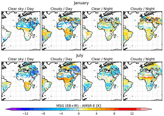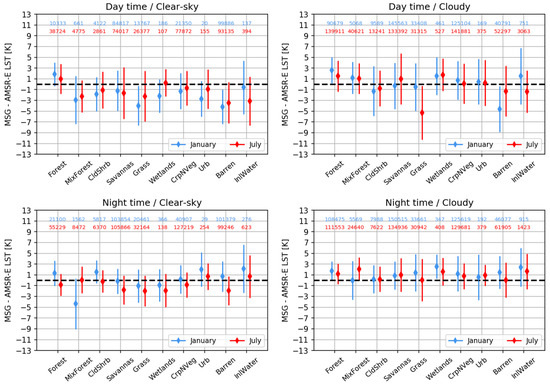 In Figure 11 the MSG/SEVIRI–AMSR-E differences are analyzed by land-cover type, for January and July, separated into day/nighttime and for clear/cloudy conditions. Land-cover types from the IGBP database [86] were aggregated into more general classes to simplify the analysis (forest, mixed forest, closed shrub lands, savannas, grass lands, permanent wetlands, croplands and newly vegetated areas, urban, snow and ice, barren, open water and inland water). This dataset was re-projected to the regular grid used to perform the comparisons and the most frequent land cover class for each grid point is considered. Due to re-gridding and land cover class aggregation, some differences between the land cover used in the processing of each dataset may be present.