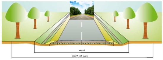 There are two definitions that apply to roads and which describe differently the space used for traffic. These are: “road” and “right-of-way”. The former definition applies to object(s) which are consistent with the common understanding of the space on which traffic takes place (road, bridge, etc.), whereas the latter defines a spatial dimension of management. According to the Public Road Act [] “road” is a structure which includes such engineering structures as (e.g., overpasses, tunnels, passages under roads, retaining walls, etc.), devices and installations which make up a technical and utility whole, intended for traffic handling and located within a right-of-way [,]. “Right-of-way” denotes land delimited with boundary lines with the space above and below its surface, which contains the road, structures and engineering devices associated with traffic, its securing and handling, as well as devices used for purposes of the road administration []. There is a perceptible difference in the spatial range between these two definitions (Figure 1).
