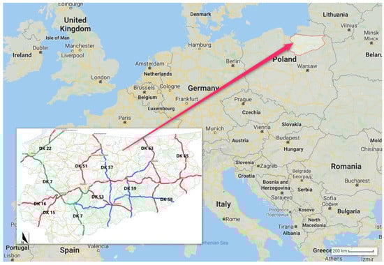 The research area covers part of the national roads situated in the Warmia and Mazury region, Poland. They are administered by the General Directorate for National Roads and Motorways (acronym of the Polish name: GDDKiA), Olsztyn Branch. In total, GDDKiA in Poland administers roads of the total length of 19,295.80 km [], which accounts for 4.6% of all public roads. A total of 4271.1 km of national roads run within town borders (i.e., more than 22.7%), and the remaining 14,530 km—outside town borders. The longest national road network is in the Mazowieckie Voivodship—2371.0 km, and the shortest is in Świętokrzyskie—754.6 km []. The European north-south road E77 and east-west road E28 run through the region under study. The road system in the region includes 1326.8 km of national roads, 1911.1 km of regional roads, 6979.8 km of county roads, and 2425.2 km of commune roads. The national roads in the region under study (see Figure 4) are international and inter-regional expressways (colour green in Figure 4), main roads of accelerated traffic (colour red in Figure 5) and main roads (colour blue in Figure 4). The study covered approx. 50% of the national roads in the Warmińsko-Mazurskie Voivodship No. DK 15, DK 16, DK 22, DK 51, DK 53, DK 57, DK 58, DK 59, DK 63 and DK 65.