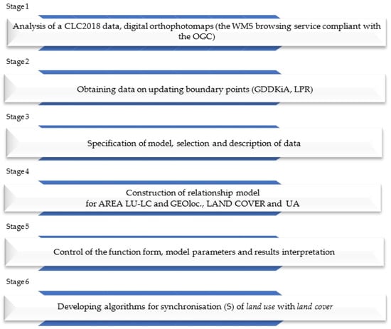 The study was conducted in six stages. In order to identify the occurring LU-LC inconsistencies on national roads, Corine Land Cover 2018 (CLC2018) data, an orthophotomap, cadastral data and result of right-of-way geodetic update were used. Using QGis software, the areas where LU-LC inconsistencies on national roads are found were identified. Three incompatible land uses were found on national roads (1.1.1: continuous urban fabric, 2.3.1: pastures, 243: land principally occupied by agriculture, with significant areas of natural vegetation). LU-LC was then compared taking into account orthophotomaps and the results of the findings of the right-of-way geodetic survey. This update was carried out by various methods depending on the set of information on the boundaries of plots (see Figure 2 and Figure 3). A method of statistical analysis and the hedonic model was used based on the discrepancies in area size (AREA LU-LC), their location (GEOloc.), land urbanisation (UA), where a discrepancy exists, and the present land use method for land intended for road traffic (LAND COVER) (stage 3–5). The form of the model was selected based on Akaike criterion [,]. The last study stage presents solution algorithms, which enable synchronisation of land use and land cover. The method of LU-LC synchronisation takes into account the valid laws and good practice principles. It should be noted that synchronisation can be achieved not only by a change in the land cover but also by signing a civil legal agreement, under which a user can use the right-of-way for other purposes. Figure 5 shows the stages of the study.