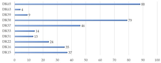 The first stage of the study indicated nine road sections where the most cases of LU-LC inconsistencies occurred. The results of the geodetic update of the national road boundaries and orthophotomaps were analysed for detailed interpretation of inconsistencies. Each case of LU-LC discrepancy was referred to the current user of the part of the right-of-way. This means that when several plots included in a right-of-way were used by one person or a group of persons, the areas of the plots were added up. The analyses showed that land use was different than the land cover in 349 cases. The highest number of cases (88) was on the national road DK 65, and the lowest (4) was on the national road DK 63 (see Figure 6).