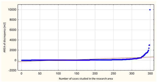 The area of all the LU-LC discrepancies was 64,885 m2. The smallest area of a discrepancy was 1 m2 and there were 18 such cases. The largest area of a discrepancy was 9990 m2 and it was situated on the national road DK 22 near the village of Mojkowo (Elbląg comune). Figure 7 shows the area distribution for all the LU-LC discrepancies.