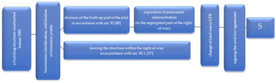 For the fragment of a building, the LU-LC synchronisation can be performed by choosing one of two solutions (see Figure 9). The first involves segregation of part of a built-up plot, in accordance with the legal procedure laid down in the Real Estate Management Act (segregation of a built-up part of a plot). When it is applied, a change of land use is entered into the Land and Property Registry (LPR) and the right of permanent administration expires (the right of the road administrator). Subsequently, a civil law agreement of sale/donation of a segregated piece of land is signed; thereby, the LU-LC synchronisation is achieved. Another solution involves leaving a structure within the right-of-way since Art. 38.1. of the Public Road Act allows for such situations: “…objects that do not pose a threat or hinder the road traffic nor do they disturb the process of performing the tasks of the road administrator can be left unchanged…” []. Leaving such an object as it is does not require any confirmation or permit for the object to remain at the place []. The solution for an object built after 1985 is shown in Figure 9.