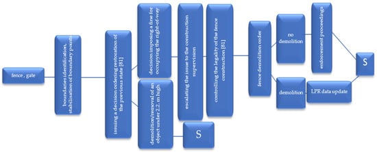 Currently, the body that administers a right-of-way, having found out that there is a fence, sends an official letter to the investor ordering them to restore the right-of-way to the previous state [], which implies that it has to be demolished or moved. If this is not done within the time limit set by the officials, the administrator escalates the issue to the construction supervisory body (architectural and construction administration body). This body verifies whether the fence was constructed in line with the valid regulations. Regardless of whether the fence was built under a building permit (e.g., when it borders on an historic object) or without such a permit, a demolition order is issued as an administrative decision []. The fence owner/investor must move or remove the fence within the set time limit so that it is situated outside the right-of-way. Otherwise, the owner/investor will pay a fine for non-contractual occupation of the right-of-way []. Apart from the road administrator, the fence owner can also apply for a permit to demolish the fence (see Figure 11). If a building permit/notification was not required for the fence construction (for fences lower than 2.2 m), the structure owner can move/remove the fence outside the right-of-way without the demolition decision. The LU-LC synchronisation takes place after the previous land arrangement is restored (Figure 11).