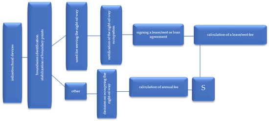 There may be equipment serving the passenger, the right-of-way, equipment supporting the right-of-way administration and equipment unrelated to the road located within the right-of-way (if they do not interfere with the traffic handling) []. For devices located within a right-of-way which are used for the road operation, a lease/rent or loan agreement is signed []. Lease/rent agreements involve payment of rent, whereas a loan is free of charge. The choice of an agreement is a consequence of the object type, its function and the person (investor) who constructed the device (e.g., local governments, public-private partnership, etc.). For example, no fees are collected for constructing the pavement lighting by a local government (commune) within the national road right-of-way in an area with housing development []; it is the opposite with passenger service facilities, such as petrol stations, parking spaces or restaurants, for which fees are collected []. Technical infrastructure devices unrelated to the road operation (e.g., power cabinet, telecom cabinet, etc.) can be constructed after obtaining a permit to occupy a right-of-way. An investor also has to pay annual fees for placing a device within a right-of-way []. A lease/rent/loan agreement or a permit to occupy a right-of-way ends the LU-LC synchronisation process (see Figure 12).