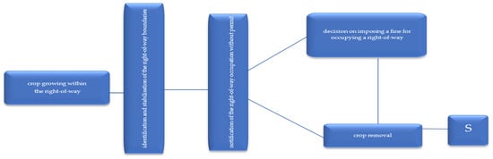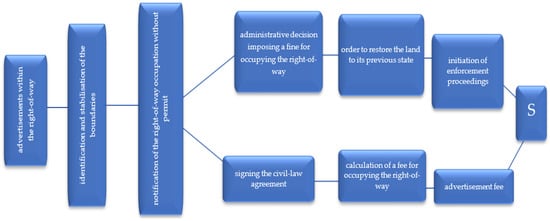 If the advertisement owner does not have the relevant documents, they pay a fine for illegal occupation of the right-of-way (10 times the amount of fee) and the time limit for its payment. The object must be removed after the set deadline and restore the right-of-way to its previous state consistent with the LPR []. If the investor fails to respond appropriately, administrative enforcement proceedings are conducted (exercising the rights/obligations arising from the civil law agreements) (see Figure 13).