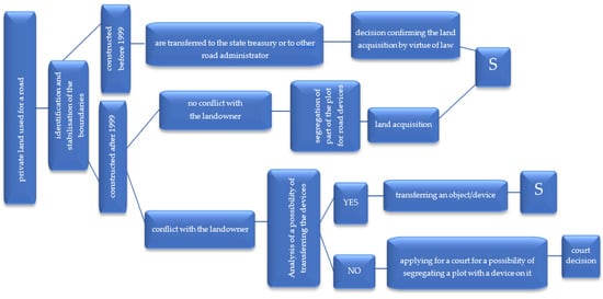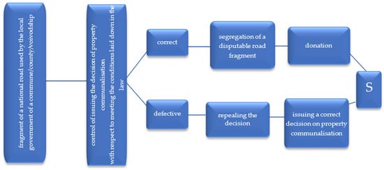 National roads in Poland can be owned by the State Treasury and other roads can be owned by respective local governments. These relations are discussed in detail in Section 2 (Background). A problem may appear in some situations when fragments of a national road are used by local governments (voivodship/county/commune) for their economic purposes. In such cases, the correctness of the property communalisation decision issuance process is first controlled [,]. If a road fragment meets all the recommendations laid down in the law, then a disputable part is segregated [] and donated to the state treasury. A defective communalisation decision, issued when the road fragment did not meet the statutory conditions, is repealed and a new one is issued, with consequent LU-LC synchronisation (see Figure 19).