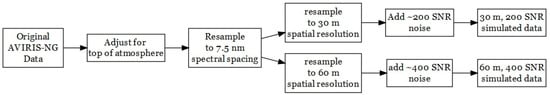 Each image was resampled to 30 m and 60 m spatial resolutions using Gaussian resampling. The stated spatial resolution represents the full-width half maximum of the Gaussian function, with the x-y coordinates for each AVIRIS-NG pixel center used to calculate each pixel’s weighting for resampling. The original unorthorectified AVIRIS-NG images were used for resampling, but pixel coordinate information allowed the creation of orthorectified 30 m and 60 m output images.