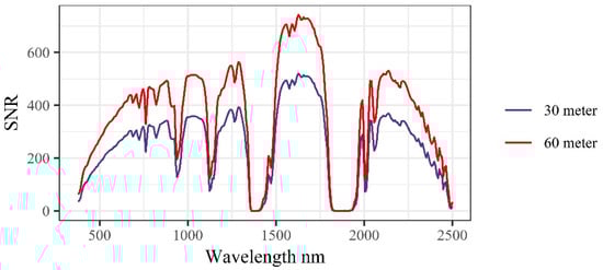 where TN is the total noise. The total noise was then converted back to radiance units by substituting TN for PN in Equation (1) and inverting. TN converted to radiance was then multiplied by a random number from a Gaussian distribution with a mean of 0 and standard deviation of 1, then added to the original radiance for each wavelength for each pixel. PN increases with increasing radiance; for low radiance values, CN dominates the total noise and for higher radiance values, PN dominates. For the 60 m image, we multiplied PN by the square root of 2. The SNR was calculated by dividing the signal by the noise. In this case, the signal was the number of photons and the noise is the total noise. The resulting average SNR for the 30 m simulated satellite images in the SWIR (2100 nm–2500 nm) was 214 and the average SNR for the 60 m simulated satellite images in the SWIR was 484. Figure 2 shows the full spectrum SNR for the two simulations.