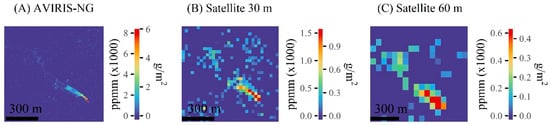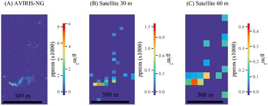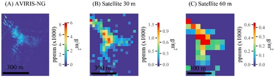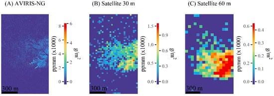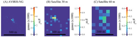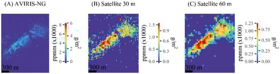 Matched filter methane retrieval results from a controlled release experiment on 17 September, 2018. (A) The matched filter results from the original AVIRIS-NG image. (B) The matched filter results from the 30 m simulated satellite image with ~200 SNR. (C) The matched filter results from the 60 m simulated satellite image with about ~400 SNR. The left side of the scale bar are units in parts per million per meter (ppm-m) above the background. The right side of the scale bar are methane units in g/m2.