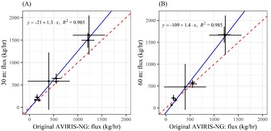(A) The 30 m flux plotted against the original AVIRIS-NG. The error bars represent uncertainty in the wind speed estimate, which in turn leads to uncertainty in the flux estimate. The R2 = 0.98, the slope = 1.3, and the y-intercept = −21. (B) The 60 m flux is plotted against the original AVIRIS-NG. The errors bars represent error due to wind speed. The R2 = 0.98, the slope = 1.4, and the y-intercept = −109. For both figures, the red dashed line is the one-to-one line and the blue line is the best fit linear regression.