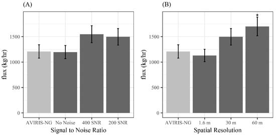 (A) The y-axis is the flux in kg/h and each bar on the x-axis represents an image. The spatial resolution is held constant (30 m) but the SNR varies from no additional noise, ~400 SNR in the SWIR, and ~200 SNR in the SWIR. (B) The y-axis is the flux (kg/h) and the bars on the x-axis represent images where the SNR is constant (200 SNR) but the spatial resolution is the native 1.6 m, 30 m, and 60 m. The 60 m image is the only image that is significantly different from the AVIRIS-NG, p = 0.019. The light gray bar in both charts is the original AVIRIS-NG for reference and the error bars represent the flux error due to wind speed uncertainty.