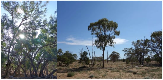 Field colour photos of Landscape A showing a riparian habitat dominated by Eucalyptus camaldulensis (left) and a floodplain habitat dominated by Eucalyptus populnea (right) in October 2015.