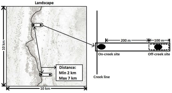 Survey design of the study showing the position of two on-creek sites (black dots) and two off-creek sites (black dots) in a landscape. Corresponding off-creek sites were located between 200 m and 300 m from on-creek sites.
