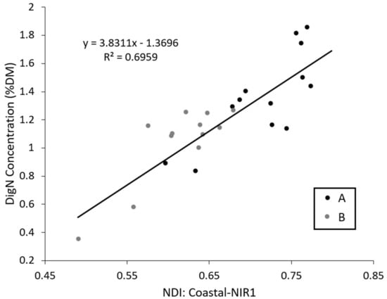 Regression of the relationship between digestible nitrogen (DigN; % dry matter) and NDI of MUL1 (Coastal) and MUL7 (NIR1) bands. NDIs were calculated from WorldView-3 images of Landscape A and B at 7.5 m spatial resolution.