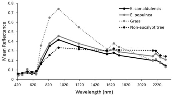 Average reflectance of Eucalyptus camaldulensis and E. populnea (solid lines), non-eucalypt tree and grass (dashed lines) at 16 spectral bands from WorldView-3 images at 7.5 m spatial resolution. The reflectance of E. coolabah and E. melanophloia were similar to these eucalypt species and not shown.