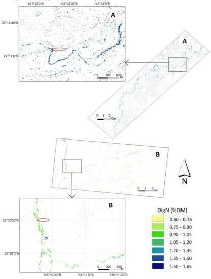 The regression equations from NDICoastal-NIR1 were applied to the pixels of trees in the WV3 7.5 m images to map foliar DigN concentration (Figure 7) across Landscape A and Landscape B. In both landscapes, the foliar DigN along creek lines stood out on the maps where the tree density was relatively higher (Figure 7). Overall foliar DigN concentration was lower in Landscape B. The trees on the floodplain (around 300 m away from the creek) in Landscape A showed high DigN concentrations but the species of these tree were uncertain because of a lack of field reference observation. GPS collar data showed koalas in the Mulgalands spent more than 80% of their time on average within riverine habitat [] and koalas tend to be found within 300 m of creek lines []. Therefore, the trees 300 m away from creek were of less importance in this study and were not observed in the field. The cluster of higher DigN in the zoomed-in area of Landscape B was a house garden with frequent irrigation, which contained mature E. camaldulensis (grown from local seedlings), non-eucalypt trees, bushes, and grass.