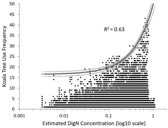Correlation between koala tree use frequency (as mapped in the field in 2010 and 2011) and log10 transformed estimated DigN concentration (% dry matter) from the WV2 image of 2012 with quantile regression fitted line for the 0.999 quantile (dark grey) and 95% confidence bounds (light grey).