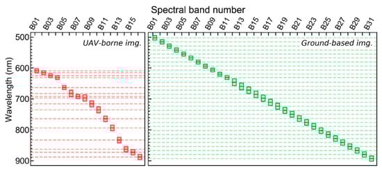 Specifications of the data acquired with the hyperspectral imaging system mounted on the UAV platform (red boxes, 16 spectral bands) and on handheld configuration (green boxes, 31 spectral bands; Section 2.3). Center line in each box indicate spectral band center and extremities for the full width at half maximum for each band (FWHM; varying between 13 and 21 nm for UAV data and between 13 and 23 nm for ground-based images).