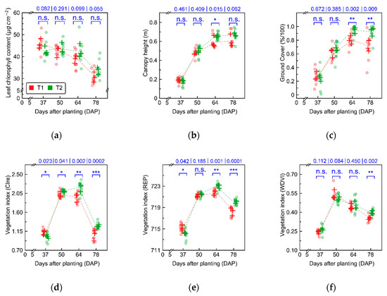 Leaf chlorophyll content (a), canopy height (b), ground cover (c), and vegetation indices (Table A2), namely, CIre (Chlorophyll Index red edge, d), REP (Red Edge Position, e), and WDVI (Weighted Difference Vegetation Index, f) derived from UAV imagery, describing crop growth under different cultivation systems (T1 and T2, “non-mixed” and “mixed” treatments, respectively). Points indicate within plot measurements (n = 3 sampling units per plot), while each cross represent the average at plot level. Lines connect the average for each treatment over time. Numbers in blue correspond to the p-value for each acquisition date. Asterisks communicate the same p-values, indicating contrasts significant at 0.05 (*), 0.01 (**), and 0.001 (***).
