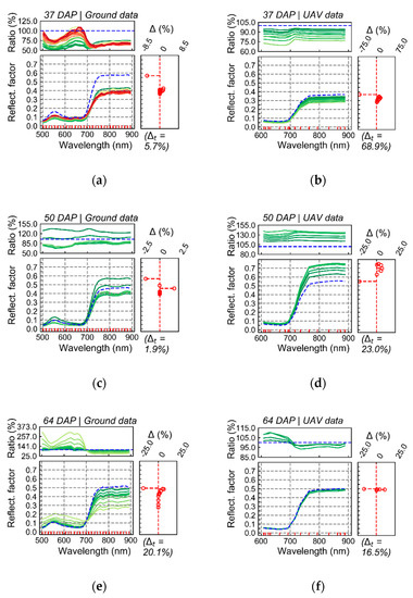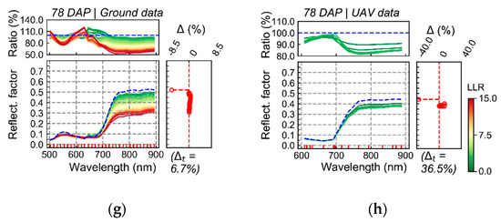 In Figure 5, average reflectance is presented for pixels grouped in discrete intervals of LLR. In this case, higher LLR values indicate higher probability for coefficients h in distribution estimated for T1 in comparison to distribution estimated for T2. Although differences in spectra with relatively stronger relationship with T1 (i.e., higher probability in the distribution for T1), in comparison with spectra having weaker association with this treatment, could be detected by both sensing approaches, the relationship observed between spectral information and the treatment of interest (T1) using UAV imagery was generally less intense. For example, in results corresponding to the first data acquisition (37 DAP), considerable differences in the visible and near-infrared are observed when comparing the first LLR interval (Figure 5a, blue line) with other intervals (Figure 5a, color scale), for ground-based data. However, these differences were attenuated (i.e., lower variation indicated by ratio values and smaller range of LLR) in UAV images (Figure 5b).