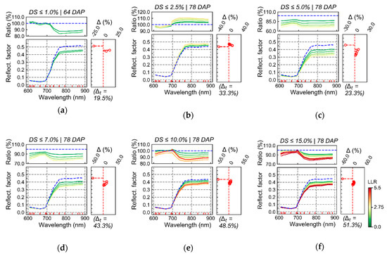 In Figure 6, average reflectance for pixels within discrete intervals of LLR are described. In this case, LLR values correspond to the evaluation of SUs classified according to a specific disease severity level (H1) against healthier SUs used as reference (H0). Only small differences between spectra with relatively stronger relationship with diseased areas in contrast with those weakly associated with these patches are observed for disease severity up to 1.0% or between 1.0% and 2.5% (Figure 6a,b). Conversely, larger differences were detected for disease severity levels starting between 2.5% and 5.0% until between 10.0% and 15.0% (Figure 6c–f). In these cases, differences are mainly observed in the red-edge and NIR spectral regions, indicating that wavelengths in this interval may have greater discriminative potential concerning reflectance measured for healthy and diseased areas.