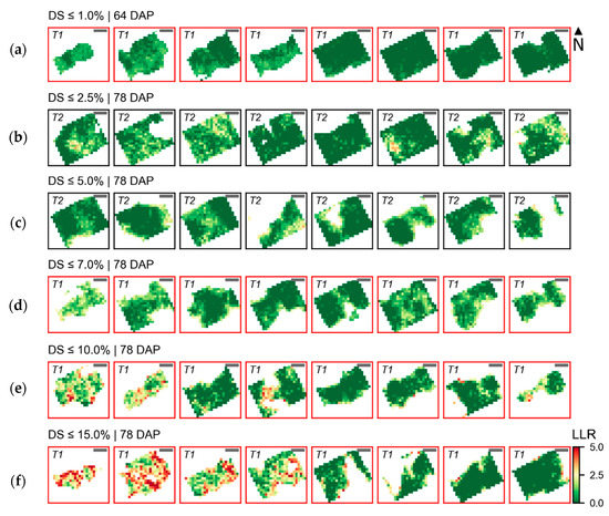 The corresponding LLR values for SUs assessed 78 DAP are presented in Figure 10, in this case considering 7.0% of late blight severity as hypothesis H1. SUs with higher disease severity levels (i.e., above 10%) were characterized by pixels with higher LLR values spread in different parts of the canopy, as also indicated in Figure 7. In contrast, SUs with lower severity levels have pixels with higher LLR values concentrated in patches with smaller leaf area index, in the boundary between the crop canopy and background.