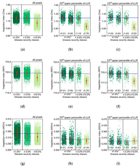Distribution of vegetation indices (VIs; CIre (a–c); REP (d–f); WDVI (g–i)) values for sampling units within different disease severity (DS) classes. Only selected VIs providing relatively good discriminative potential between healthier references, and the DS classes considered (Table A8) for UAV imagery acquire 78 DAP are presented. Green dots indicate pixels within a given DS class (from ≤1.0% up to between 10.0% and 15.0%), while red dots and red error bars correspond to median and standard deviation for these observations. Values in parentheses indicate the log-likelihood ratio (LLR) threshold used to selected pixels in a given percentile. Black dashed lines separate healthier observations (references—*) from other DS classes. Blue dashed lines indicate the average VI value for pixels included in the references. It is worth noting that for the percentiles, two distinct sets of pixels represent the reference, one for each DS class above 1.0% DS.