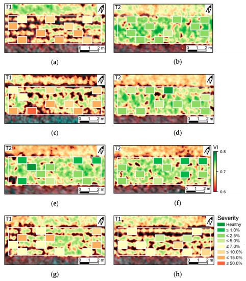 Distribution of visual scores into specific classes of late blight severity (according to the approximate percentage of affected leaf area) in SUs evaluated 78 DAP. Experimental plots 1–8 are indicated by figures (a–h). Background images include values of OSAVI (Optimized Soil Adjusted Vegetation Index; VI) for pixels retained after vegetation segmentation and a false color composite (833, 663, and 609 nm as RGB bands).