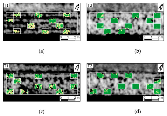 Distribution of experimental plots and treatments (T1, non-mixed system; T2, mixed system) in the study site. Figures correspond to false color composite (735, 631, and 609 nm as RGB bands) for UAV imagery acquired 37 (a), 50 (b), 64 (c), and 78 (d) days after planting (DAP). White boundaries indicate small and large experimental plots. Original experimental arrangement is indicated by black connectors and new blocks used for treatments comparison (as described in Section 2.6) are indicated in blue.