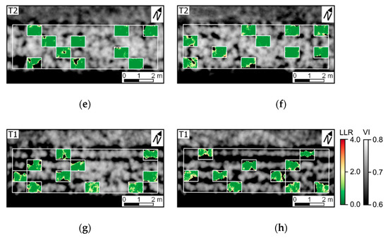 Log-likelihood ratio (LLR) for UAV data acquired 78 DAP (i.e., last data acquisition). LLR represents the comparison of pixel-wise probability considering distributions for diseased SUs (H1: ≤ 7.0% severity) and a healthy reference (H0: up to 1.0% late blight severity). OSAVI values are indicated in grey scale (VI). Experimental plots 1–8 are represented in figures (a–h).