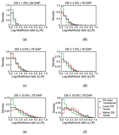 Distribution of log-likelihood ratio (LLR) values derived for patches of UAV images acquired 64 and 78 DAP. Black lines correspond to LLR extracted from sampling units (SUs) within the late blight severity level (disease severity (DS)) considered as hypothesis H1 (≤1.0%, ≤2.5%, ≤5.0%, ≤7.0%, ≤10.0% and ≤15.0% of disease severity in a–f, respectively), while comparing with healthier plants (H0, completely healthy for 64 DAP and ≤1.0% severity for 78 DAP). Green lines indicate the distribution of LLR values for SUs with lower severity levels than the class considered in each case (e.g., all sampling units with disease severity ≤1.0% in b). Red lines illustrate the distribution of LLR values for SUs with higher severity levels than the class considered in each case (e.g., all sampling units with >2.5% of disease severity in b).