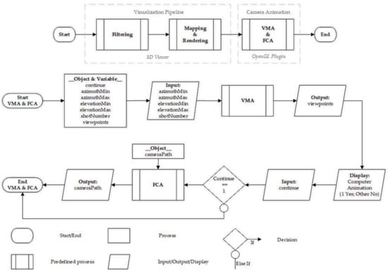 3D geovisualization process including an automatic computer animation (ISO 5807). VMA: viewpoint management algorithm; FCA: flythrough creation algorithm.