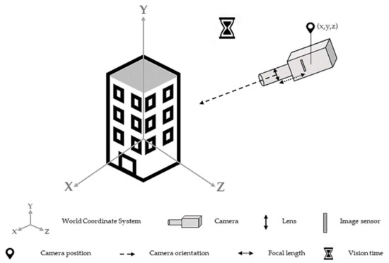 This section proposes a brief review of the camera settings within 3D viewers. First, a virtual camera behaves as a real camera since it “converts electromagnetic radiation from an object into an image of that object and projects that image onto a surface” [29]. Within the framework of this research, the objects are in three dimensions and the projection surface is plane. Then, the virtual camera settings (A) can be formalized according to four components: a camera position (A1), a camera orientation (A2), a focal length (A3), and a vision time (A4). Mathematically [20]: