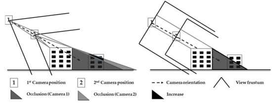 To date, the algorithms only deal with parallel projections, which means that the camera focal length is set at infinite. This consideration is explained by the higher complexity to compute the most appropriate distance from which the camera should look at the 3D scene with perspective projections. As shown in Figure 3, moving to the camera position 2 enhances the framing as it crops the image on the objects of interest. As such, their projected area increases. However, this operation extends the hidden faces ratio with the perspective projection (left image). Indeed, the big building produces more hidden faces on the small building after moving to camera 2 (black section), which is not the case with the parallel projection (right image). As a consequence, a tradeoff between the OOIs’ projected area gain and loss has to be found to get the optimal camera position. Nevertheless, it is different for each initial camera position as it depends on the camera elevation and the spatial distribution of OOIs. A discussion about this particular issue is provided in Section 4.3.