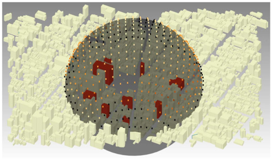 A visibility sphere. Viewpoints in black do not allow an overview of all objects of interest (red buildings). The other points of view are categorized with an equal interval ranking method.