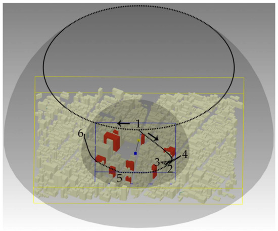 An automatic camera path for exploring a set of objects of interest (red buildings) within the virtual 3D city model of New York. Successive viewpoints are displayed in black. The 3D model overview starts at position 1 and turns clockwise. Then, the camera moves to the best global viewpoint (position 2) before visualizing local points of view (3, 4, 5, and 6). The 3D geospatial model and OOIs’ bounding boxes and their center are respectively displayed in yellow and blue. Note that the camera orientation shifts to the OOIs’ bbox center (blue) when moving to the global viewpoint.