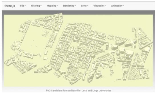 Figure 8 illustrates the web application with the virtual 3D LOD2 city model of Brussels (provided by the Brussels Regional Informatics Centre). The File tab allows users to load the objects of interest and the visualization context objects, either separately (i.e., into two distinct files) or within the same file. In the latter case, the Filtering tab is used to divide the objects into the two previous categories. To date, the web application only loads the COLLAborative Design Activity (COLLADA) mesh file format as the latter supports the 3D objects’ texturing and the 3D environment parameters, thus integrating the previous visualization pipeline phases (Figure 1). However, additional mesh file formats could be accepted, such as OBJ, FBX, and 3DS as they also store the 3D objects’ appearance. As the web application constitutes a proof-of-concept for future 3D “intelligent” viewers, i.e., incorporating design guidelines within the 3D geovisualization process, the Mapping and Rendering tabs warn users against graphical conflicts that might appear when applying a style to the features and/or the environment. Eventually, the Viewpoint and Animation tabs respectively implement the viewpoint management and flythrough creation algorithms. Via these two tabs, users can parametrize (e.g., defining the viewpoints orientation to be processed) and launch the algorithms, as well as visualize the results.