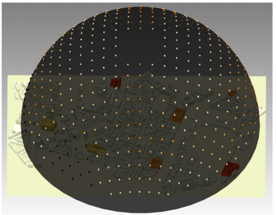 Figure 6 shows the visibility sphere for the objects of interest, which displays the efficiency of each processed point of view. Viewpoints in black do not provide an overview of all OOIs; one or several object(s) of interest is/are either completely occluded or viewed under the visibility threshold. Then, an equal interval ranking method categorizes viewpoints standardized values for which all OOIs are simultaneously visible.