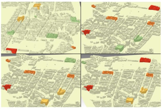 The main advantage of the viewpoint management and flythrough creation algorithms is the independence from the 3D geospatial data to be analyzed. As the algorithms operate on the screen pixels, they can be applied to vector data, raster data, and even point clouds [26]. As such, the algorithms are an efficient solution to manage occlusion from any kinds of data and for any application domains. For instance, VMA has already facilitated the knowledge dissemination in archeology for an ancient mosaic in the oratory of Germigny-des-Prés (France) [43]. Then, the algorithms can run with any file formats as long as they store 3D objects’ texturing and 3D environment parameters. Indeed, VMA and FCA have been incorporated into a broader semantic driven visualization process, and therefore manage occlusion by considering additional and complementary visualization techniques. Eventually, the algorithms are implemented into a web application accessible from any HTML5-compatible browsers, which is an easy way to distribute and employ them.